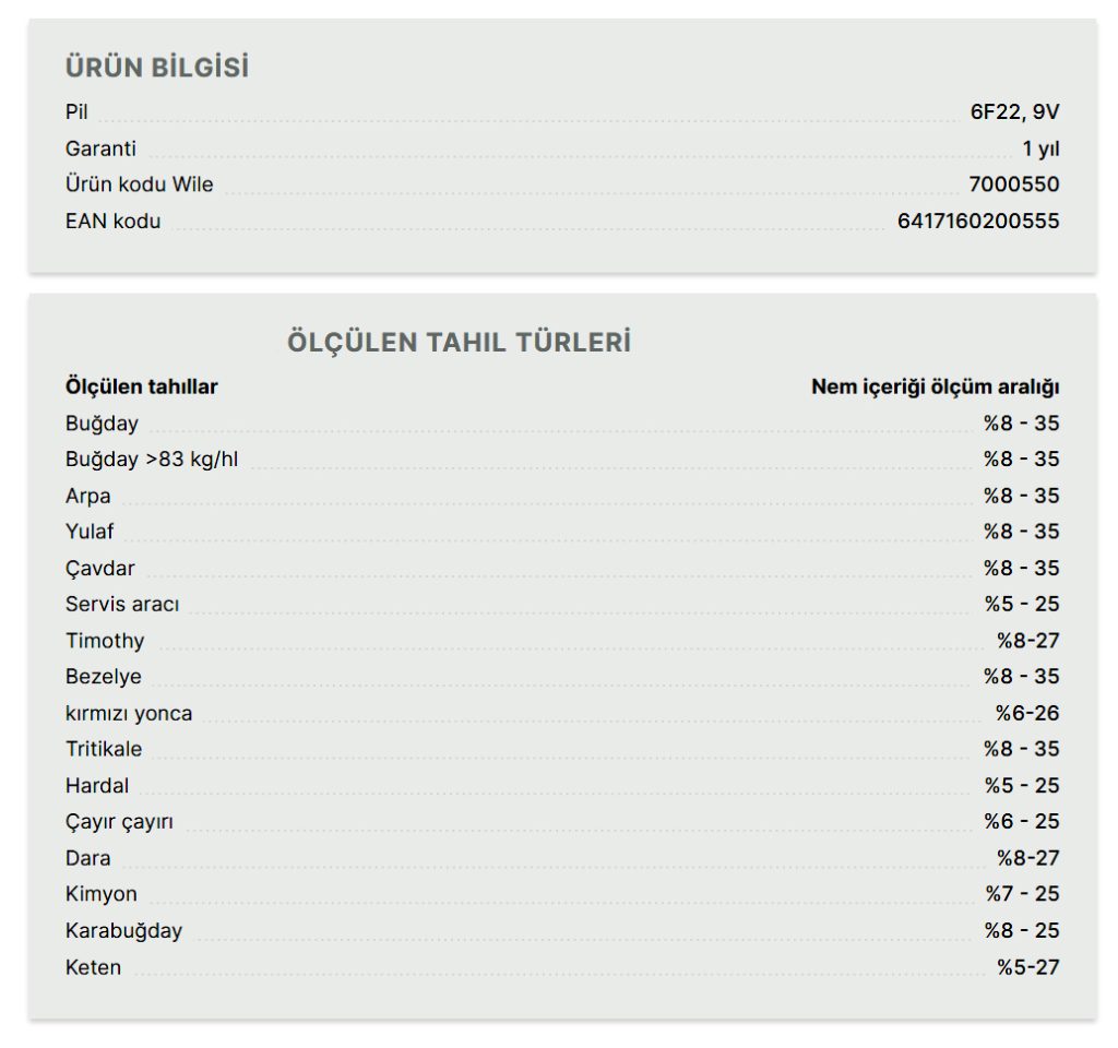 – Wile 55 tahıl nem ölçerin nemini ölçebildiği ürünler; Arpa, Buğday, Mısır, Yulaf, Çavdar, Çeltik, Kırmızı mercimek, Yeşil mercimek, Kuru fasulye, Nohut, Ayçiçek, Sorgum, Kanola, Soya, Makarnalık buğday…
